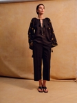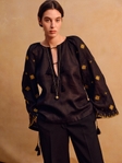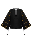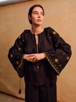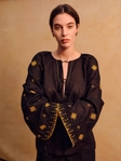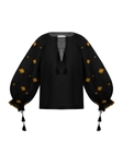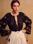 Низ рукава збирається за допомогою завʼязок з китицями, що дозволяє регулювати форму та додає мʼякого руху. Чорний колір підсилює контраст золотої вишивки, роблячи орнамент глибоким і виразним.