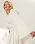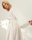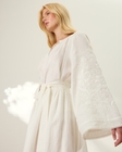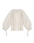 Лаконічна і водночас багата на символи. Лляна вишиванка в молочному кольорі з об’ємними рукавами — це сучасне переосмислення української традиції.Монохромна вишивка створює делікатний рельєфний візерунок: стилізовані квіти та рослинні мотиви, які символізують оновлення й силу життя.