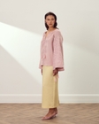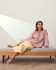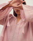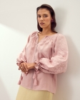 Модель виконана у прямому вільному крої з рукавом-реглан, що м’яко окреслює плечі та забезпечує комфортну посадку. Об’ємні рукави можуть носитися у двох варіантах: вільно розкритими або зібраними на зав’язки з китицями, що дозволяє змінювати силует залежно від настрою.