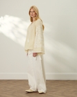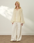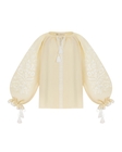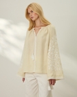Модель виконана у прямому, вільному крої з рукавом-реглан, що м’яко лягає по плечу та створює легкий, невимушений силует. Об’ємні рукави зібрані внизу за допомогою зав’язок із китицями, що дозволяє регулювати посадку та формувати силует — від розслабленого до більш виразного.