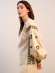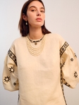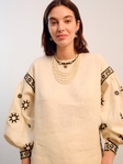Технічний опис: • Матеріал: 100% льон • Декор: машинна вишивка (геометричний орнамент «зорі») • Колір тканини: беж • Колір вишивки: чорний, золотистий • Крій: вільний, з манжетами на ґудзиках • Довжина виробу: до стегон • Рукав: об’ємний, довгий, із зібраною манжетою • Догляд: ручне прання, або хімчистка