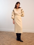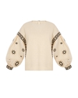 Об’ємні рукави прикрашені густою вишивкою у чорних та золотистих відтінках, а вузькі манжети підкреслюють витонченість силуету. Вільний крій забезпечує комфорт і свободу рухів.